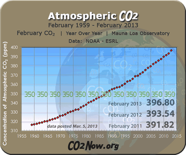 (今年二月份大氣層二氧化碳的累積量是 396.80 ppm)