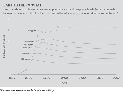 減少二氧化碳的排放,對地球暖化絕對有幫助,但不能解決的問題。即使全球立刻停止二氧化碳的排放,這當然幾乎不可能,地球暖化帶來的後果,很長一段時間也不會消失。依照下圖,不到一百年,二氧化碳的累積量到了 1200 ppm,地球溫度上升 4 度,影響有多大,好萊塢已經預告過了,而且會延續一千年。今年二月份同溫層的二氧化碳累積量是 396.80 ppm(下圖二)。